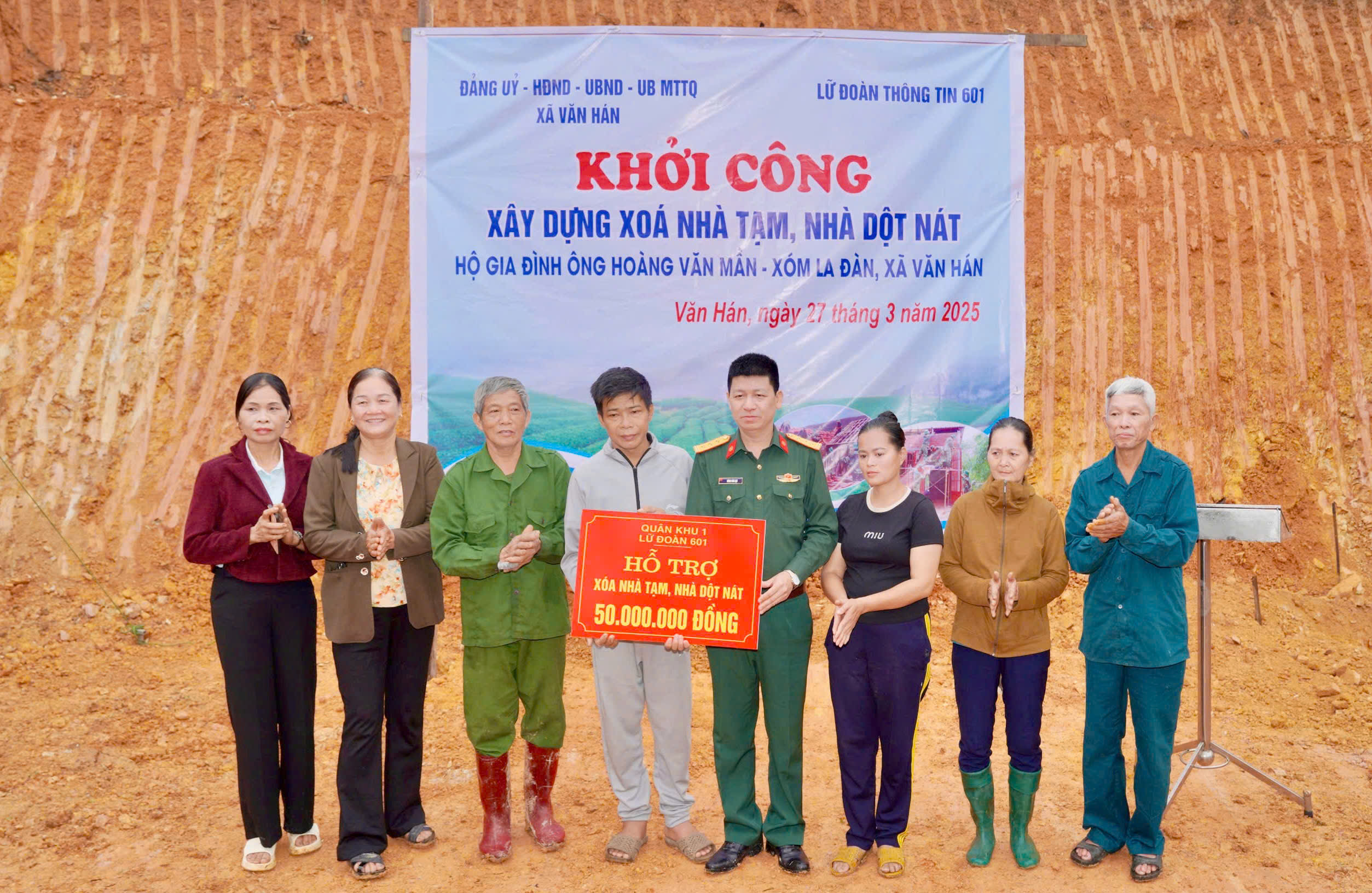 Gia đình ông Hoàng Văn Mần, xóm La Đàn, xã Văn Hán thuộc đối tượng hộ nghèo, gia đình có hoàn cảnh đặc biệt khó khăn, bản thân mắc bệnh nặng, cả gia đình chung sống trong ngôi nhà cũ đã xuống cấp trầm trọng, có nguy cơ đổ sập. Hưởng ứng phong trào thi đua cả nước chung tay “Xóa nhà tạm, nhà dột nát”, cán bộ chiến sĩ Lữ đoàn Thông tin 601 đã chung tay giúp đỡ ủng hộ số tiền 50 triệu đồng cùng một số ngày công xây dựng. Chính quyền và các đoàn thể xã Văn Hán cùng huy động bà con nhân dân cùng chung tay giúp đỡ gia đình xây dựng ngôi nhà mới, phấn đấu hoàn thành trong tháng 5/2025.
